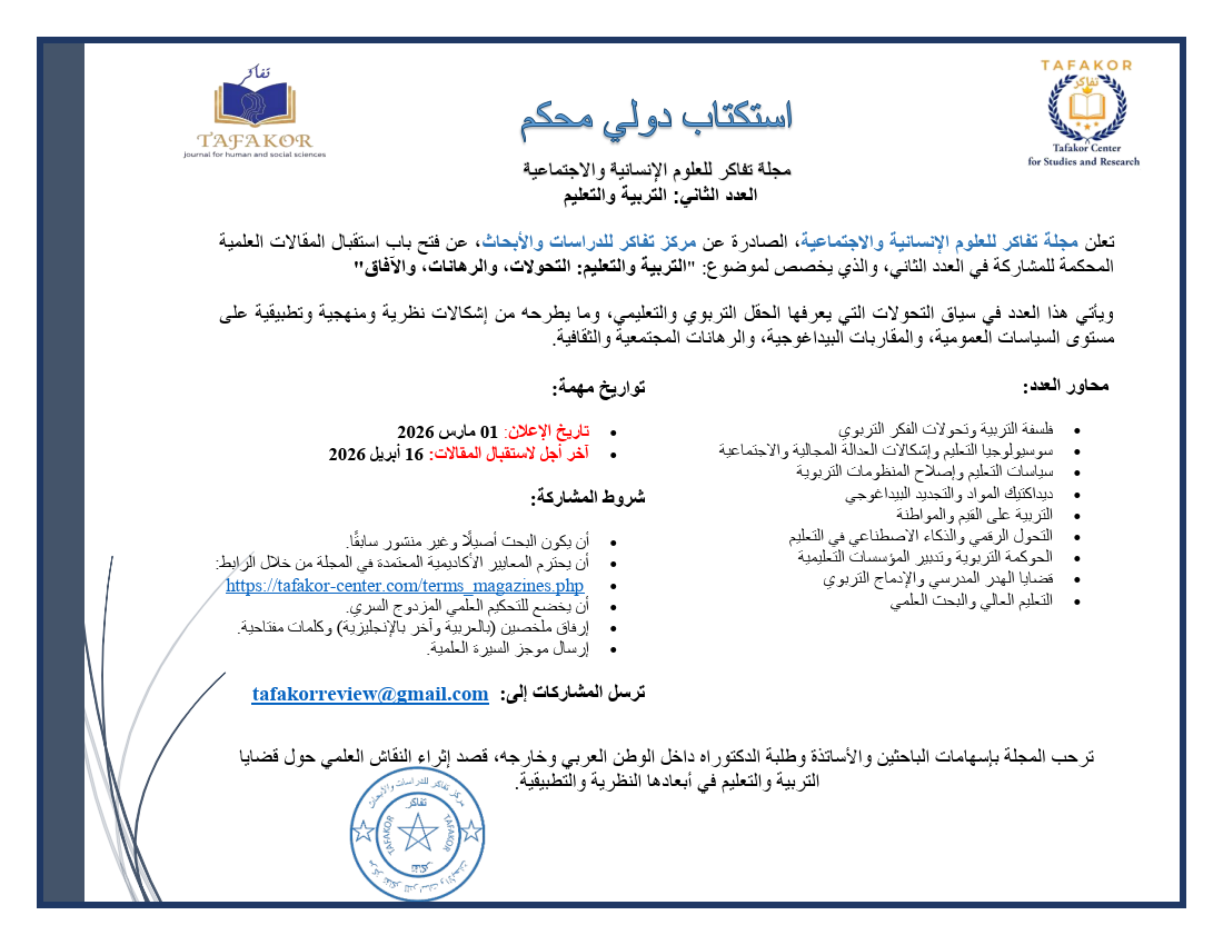 تسجيل الدخول دخول ليس لديك حساب؟ سجّل الآن هل نسيت كلمة المرور؟ اضغط هنا جديد استكتاب العدد الثاني لمجلة تفاكر للعلوم الإنسانية والاجتم... مجلة تفاكر للعلوم الإنسانية والاجتماعية العدد : 1 التقويم التربوي استكتاب العدد الأول من مجلة تفاكر للعلوم الإنسانية والاجت... Français pour Débutant English Course نهضة الذكاء الاصطناعي في حياتنا اليومية Slider استكتاب العدد الثاني لمجلة تفاكر للعلوم الإنسانية والاجتماعية مجلة تفاكر للعلوم الإنسانية والاجتماعية العدد : 1 التقويم التربوي استكتاب العدد الأول من مجلة تفاكر للعلوم الإنسانية والاجتماعية Français pour Débutant English Course نهضة الذكاء الاصطناعي في حياتنا اليومية المجــلات مجلة تفاكر للعلوم الإنسانية... استكتاب العدد الثاني لمجلة تفاكر للعل... مجلة تفاكر للعلوم الإنسانية والاجتماع... التقويم التربوي آخر المجلاتالمزيد مجلة تفاكر للعلوم الإنسانية والاجتماع... آخر الأبحاث ودراسات محكمةالمزيد التقويم التربوي آخر الإصداراتالمزيد آخر المقالات وترجمات وحواراتالمزيد نهضة الذكاء الاصطناعي في حياتنا اليومية آخر الأنشطةالمزيد استكتاب العدد الأول من مجلة تفاكر للع... استكتاب العدد الثاني لمجلة تفاكر للعل... آخر الدوراتالمزيد English Course Français pour Débutant
